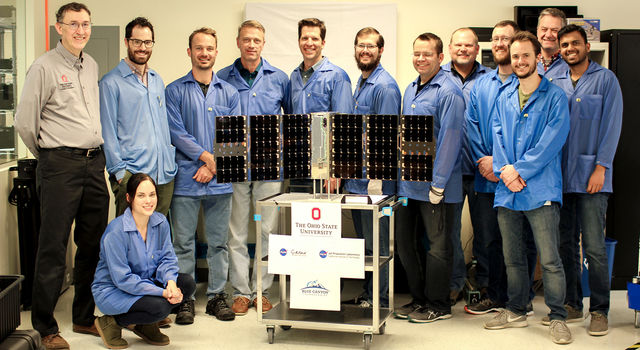 The CubeRRT satellite and Blue Canyon Technologies team members with Principal Investigator Joel Johnson (far left) of The Ohio State University. Credit: Blue Canyon Technologies