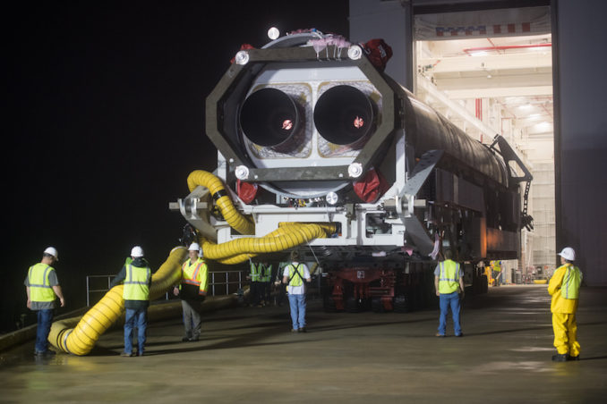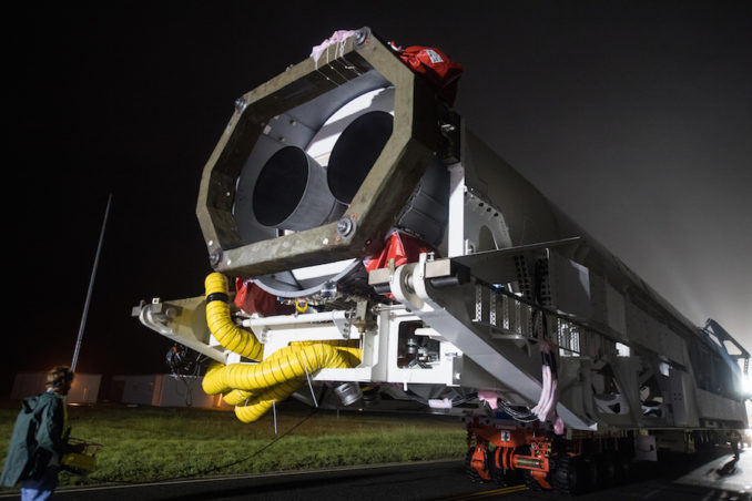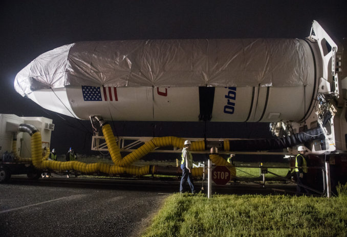 Riding a self-propelled transporter, the two-stage booster rolled out of Orbital ATK's Horizontal Integration Facility on Wallops Island, Virginia, after nightfall Thursday for the mile-long journey south to pad 0A, where crews planned to hoist the 139-foot-tall (42.5-meter) launcher vertical for final preflight checkouts.