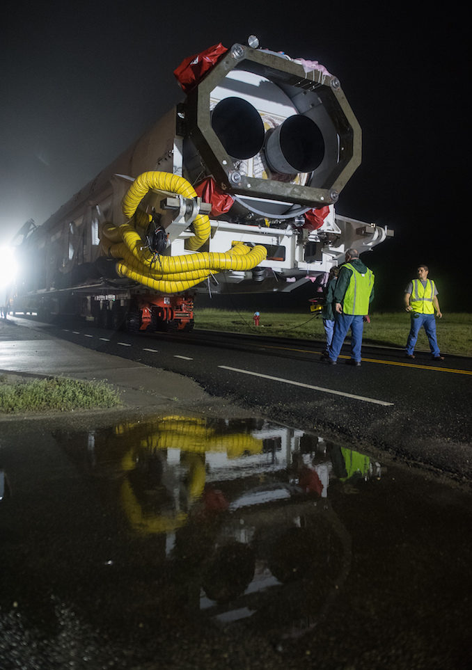 The Antares rocket from Orbital ATK makes its way to the launch pad at Wallops Flight Facility in Virginia. The Antares will launch the Cygnus spacecraft on a cargo resupply mission to the International Space Station.