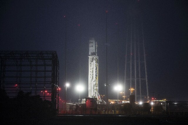 And we're up! #Antares sits vertical on @VCSFA_MARS Pad 0A at @NASA_Wallops. Launch is set for Monday, May 21 at 4:39am EDT/8:39am UTC