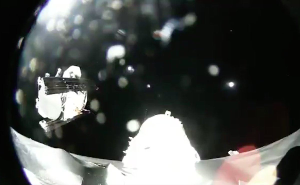 Hisdesat's Paz satellite seen separating from the Falcon 9 rocket's upper stage. SpaceX's demo broadband satellites Tintin A and B are visible on the left and right attached to the upper stage. Credit: SpaceX video still.