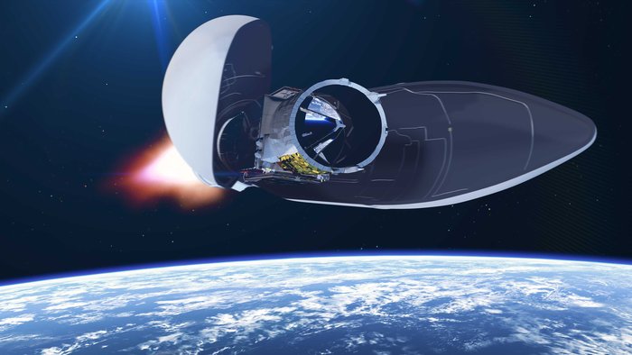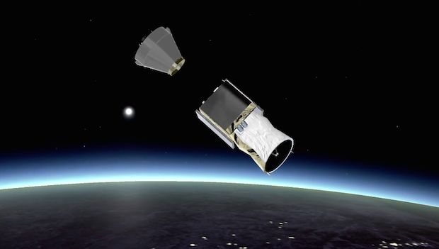 The Vega's 8.5-foot-diameter (2.6-meter) payload fairing is released as the rocket ascends into space.