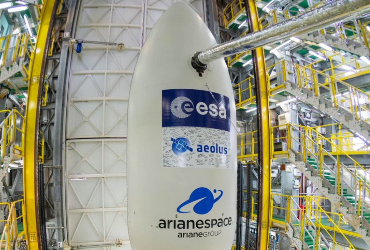The Aeolus satellite, shrouded inside a payload fairing, was lifted atop its Vega launcher in French Guiana earlier the month. Credit: ESA/CNES/Arianespace – Photo Optique Video du CSG – G. Barbaste