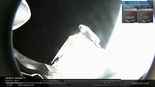 The first stage fired for two minutes and 38 seconds, just around five seconds shy of its maximum possible burn time to deliver the performance needed to send GovSat-1 toward its high-energy target orbit. MECO occurred after the first stage accelerated the stack to a speed of 2.32 Kilometers per second and the two stages of Falcon 9 parted ways two seconds later via four pneumatic pushers.