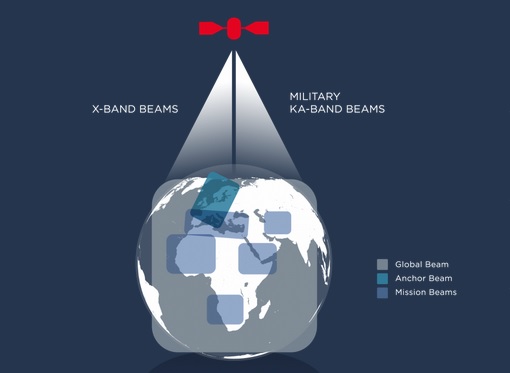 "The second mission of the payload of this satellite is in military Ka-band," Biewer said. "Here we are deploying an anchor beam that is ideally suited to providing connectivity to headquarters, and we also have two steerable high-power military Ka-band beams. One is designed and shaped to cover the Mediterranean Sea to support high-power and high-bandwidth applications, specifically for ISR, which is for intelligence, surveillance and reconnaissance applications."