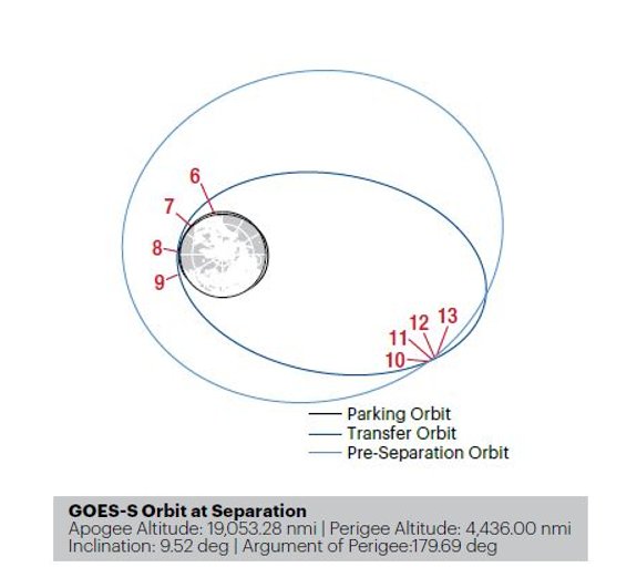 Over 2 weeks, @NOAASatellites #GOESS 's main engine will take it from this transfer orbit of 8200 x 35300 km to a geosynchronous orbit. The perigee at #AtlasV insertion is slightly and inclination slightly than #GOESR GTO insertion. Tricky question: 13% votes