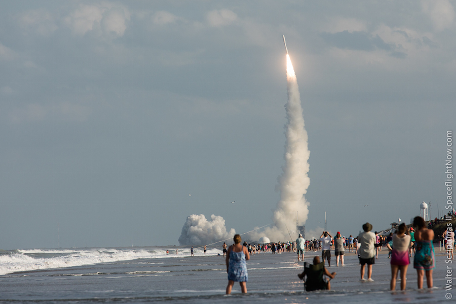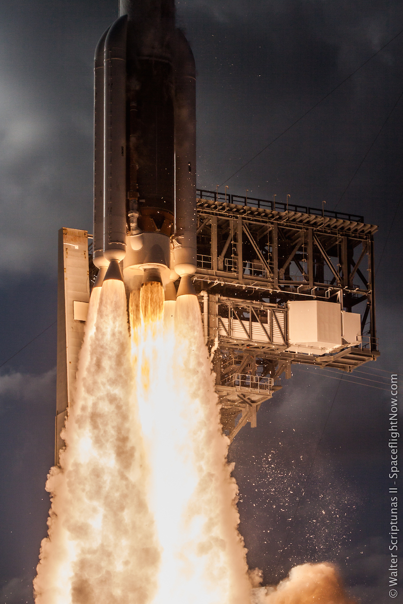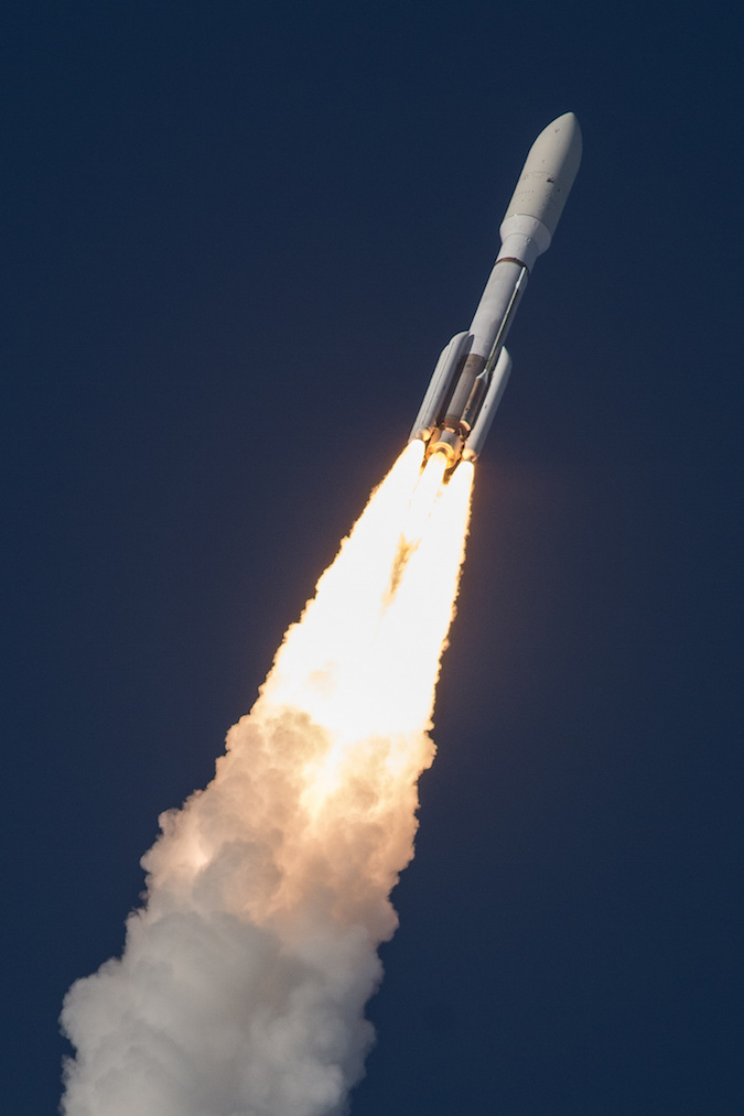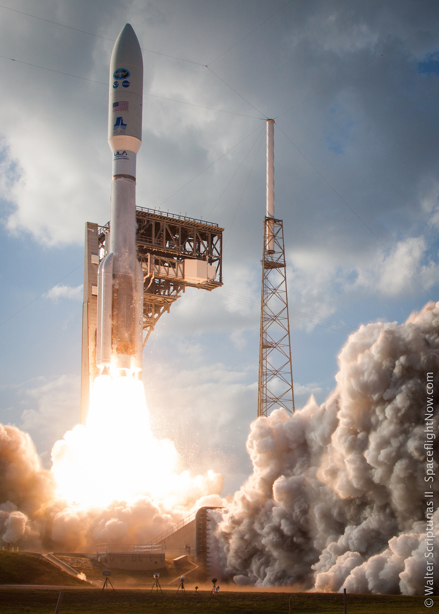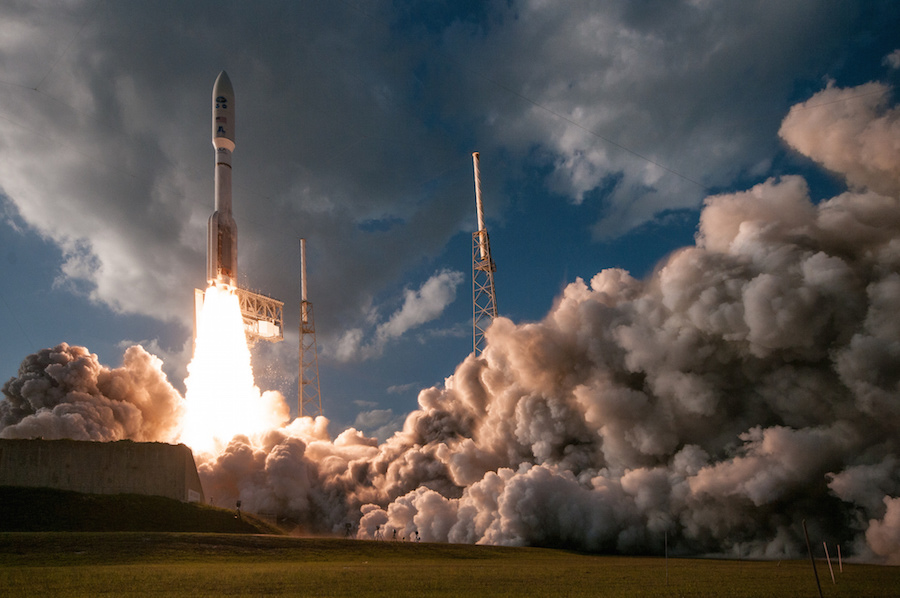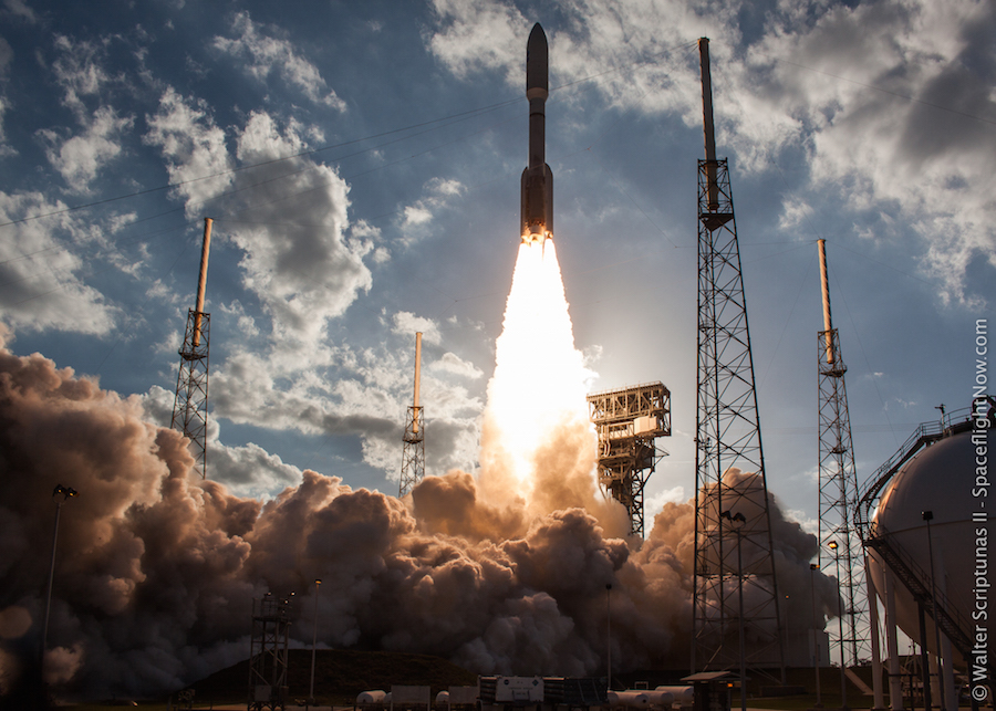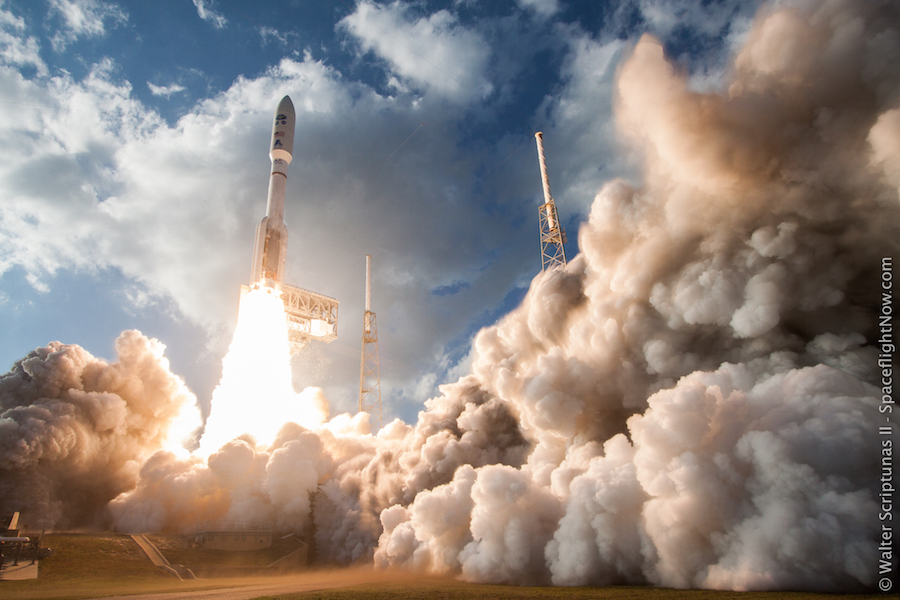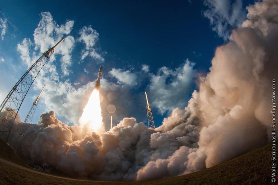 These photos show the rocket lifting off with more than 2 million pounds of thrust from a liquid-fueled RD-180 main engine and four solid rocket boosters.