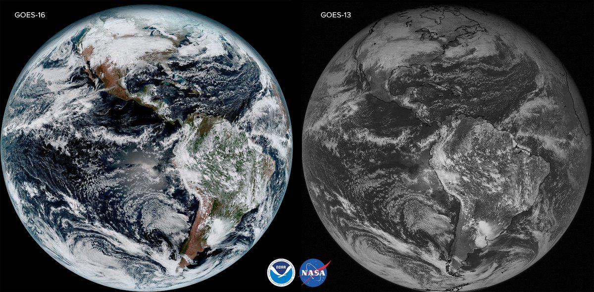 A side-by-side comparison of images captured by GOES-16, a clone of GOES-S already in orbit, and a previous-generation GOES weather satellite. Credit: NOAA