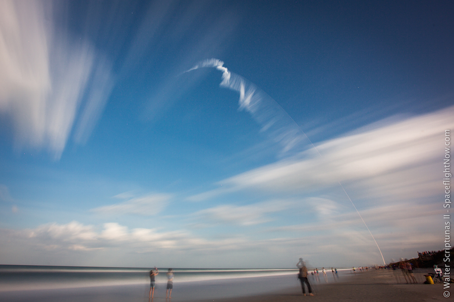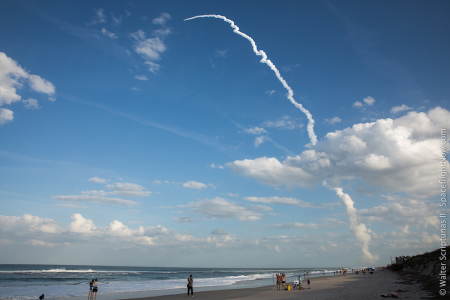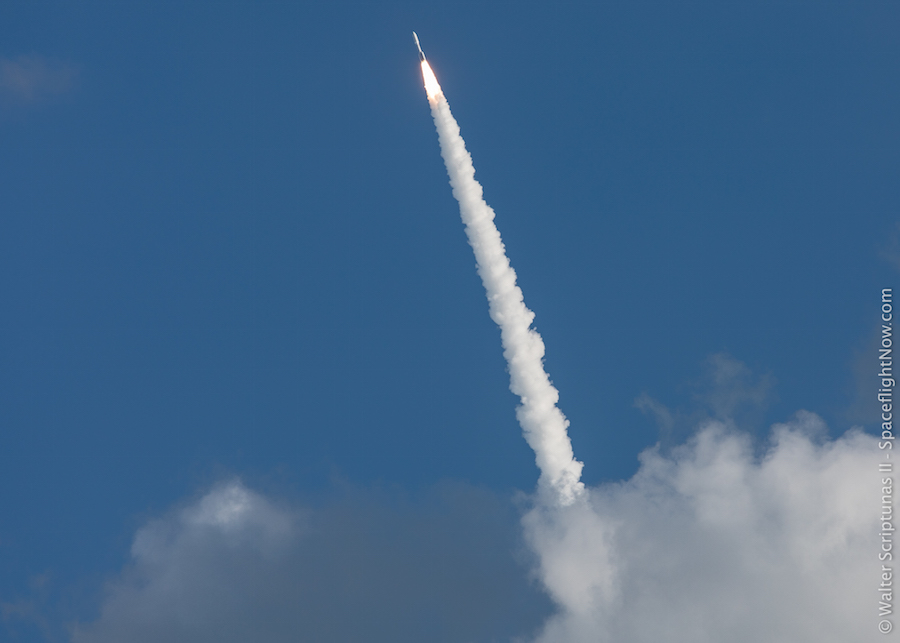 Burning almost a ton of kerosene and liquid oxygen propellant per second, the RD-180 engine continued firing until nearly four-and-a-half minutes into the mission. Moments later, the booster stage dropped away to fall into the Atlantic Ocean, and an RL10C-1 upper stage engine ignited for the first of three burns on Thursday's flight.