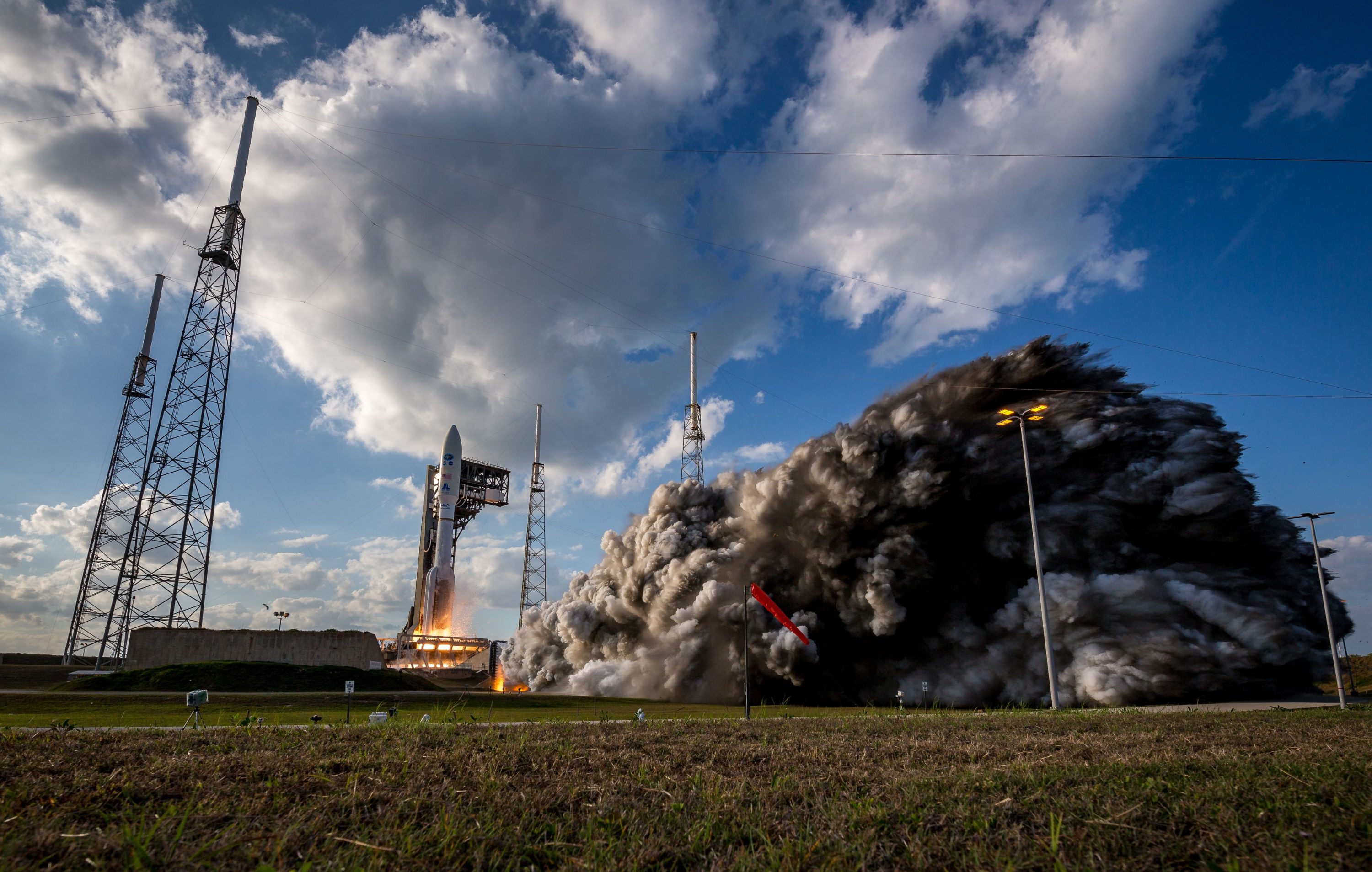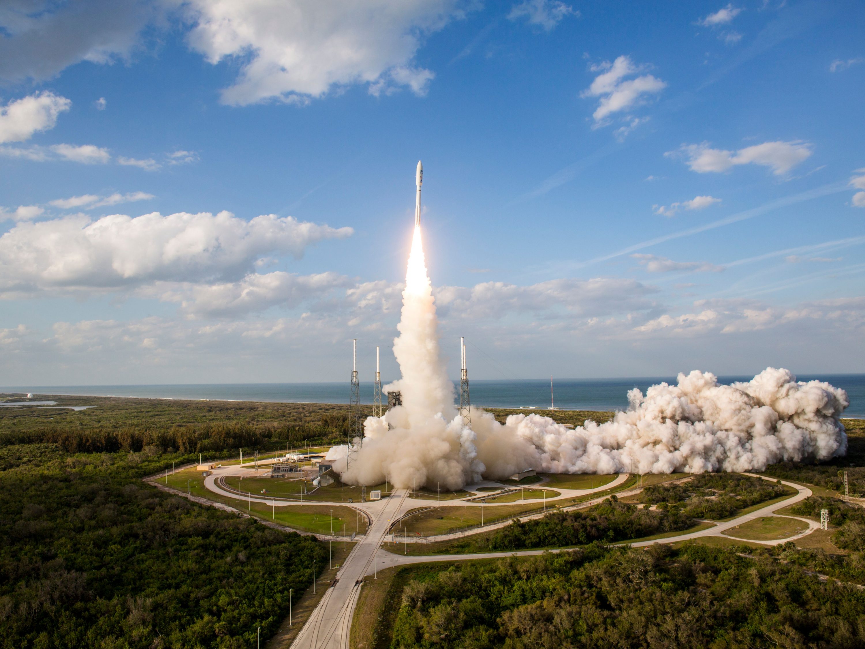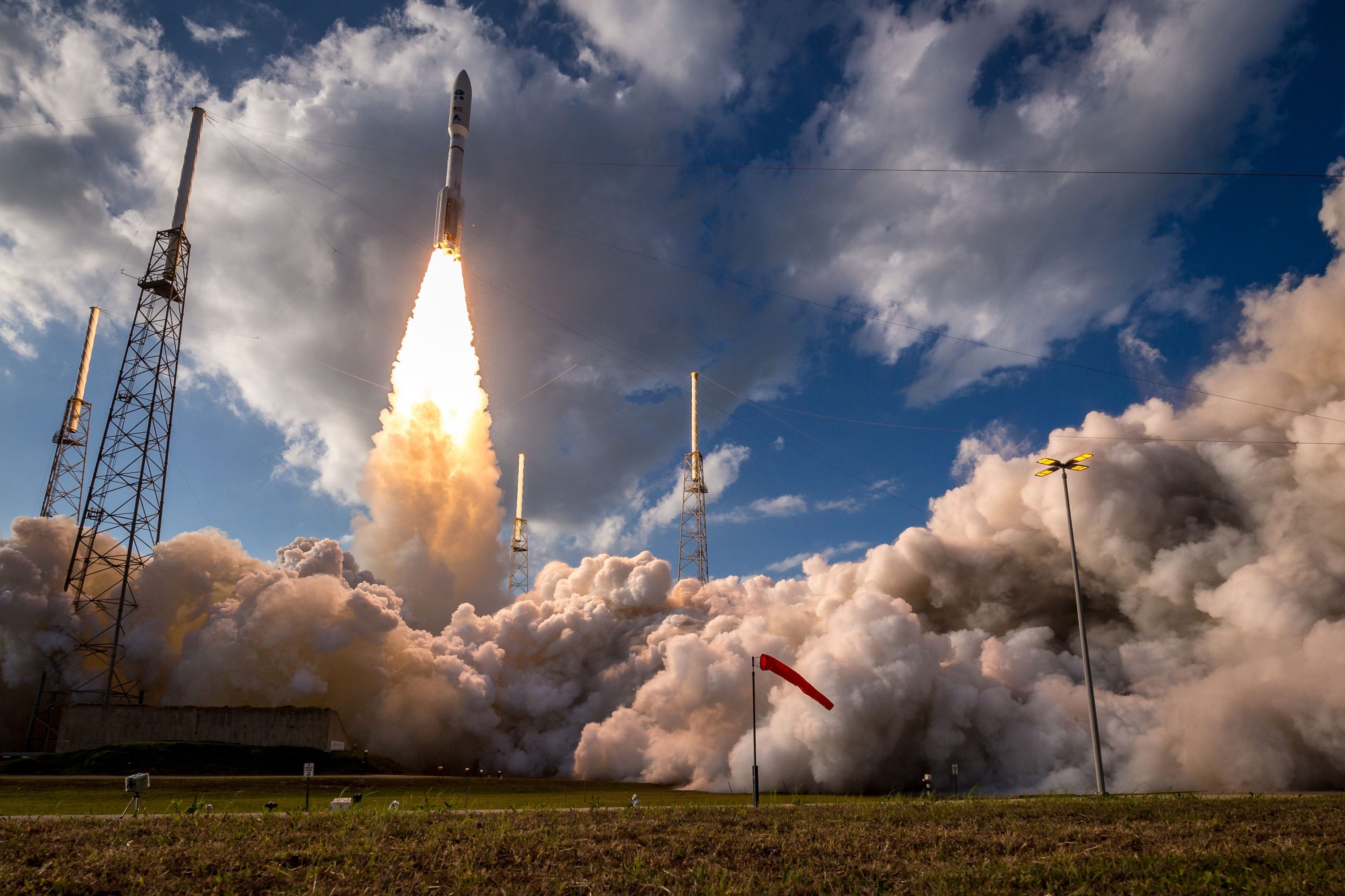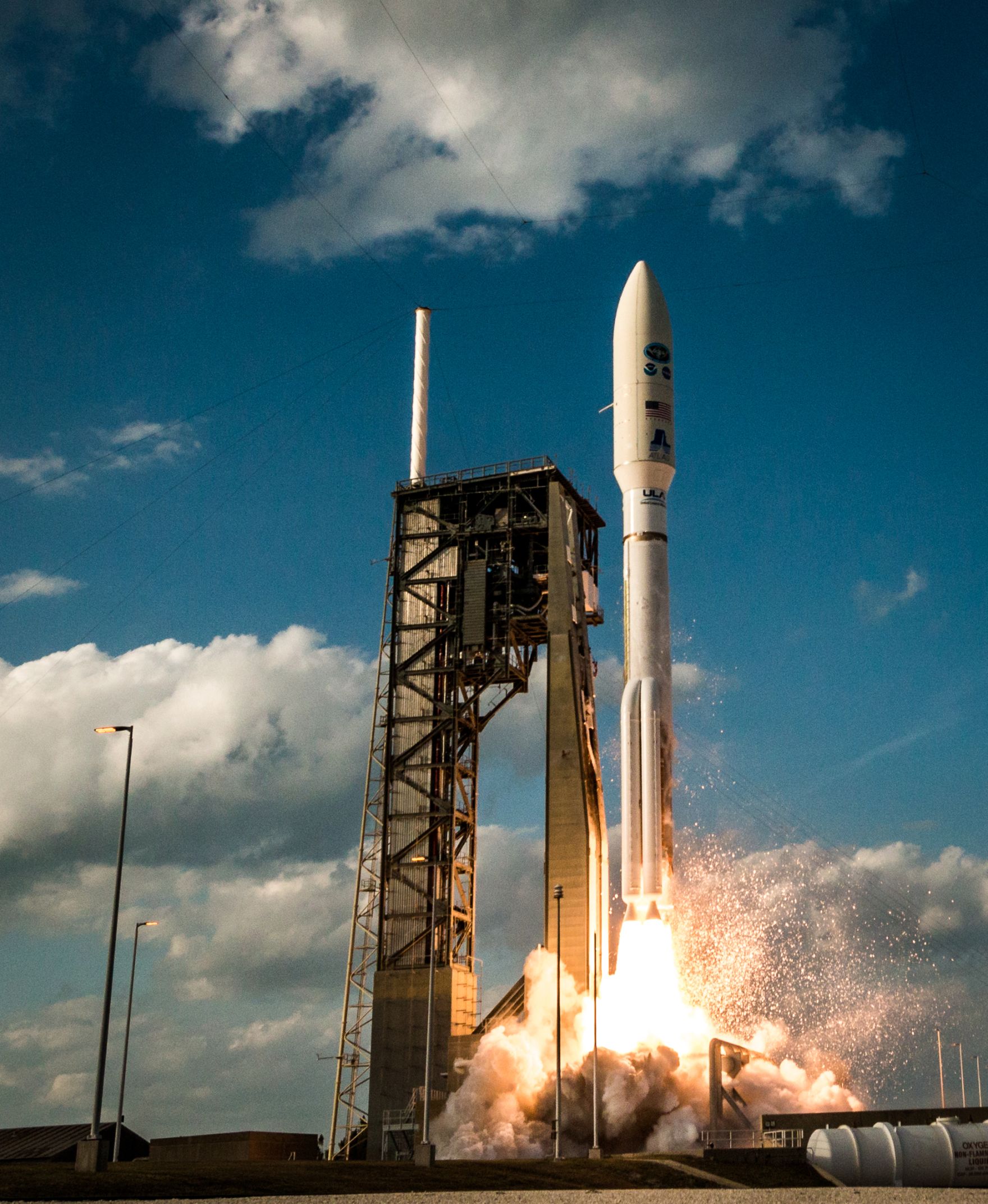 Sporting four Aerojet Rocketdyne strap-on solid rocket motors and a Russian-made RD-180 main engine, the Atlas 5 rocket climbed through a mostly sunny sky, darting through puffy clouds and leaving a twisting exhaust plume in its wake as the launcher departed to the east from Florida's Space Coast on 2.1 million pounds of thrust.
