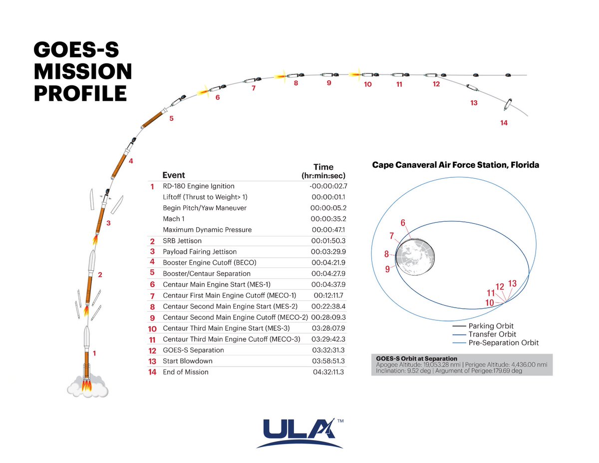 Separation of the GOES-S spacecraft is expected three hours and 32 minutes after liftoff to be sent on its way to complete eight days of orbit-raising and four days of fine-tuning to arrive in its desired Geostationary Orbit. Partial Solar Array deployment is planned six minutes after separation and two-way command and telemetry operations should be established by T+3 hours and 52 minutes.