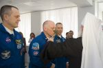 With a liftoff time near midnight, the crew trio started their final launch preparations after waking up from a mid-day nap to rest up for a long night of activities. After a final shower in the comforts of gravity and dinner at the Cosmonaut Hotel, the crew participated in the commemorative signing of their hotel room doors before receiving their pre-flight blessing and being sent off by a crowd of Cosmodrome employees and families. At Site 254 of the Cosmodrome, the crew donned their Sokol Launch and Entry Suits and went through leak checks before departing for Site 1/5 – the primary on-ramp to space for crewed missions from Baikonur since Gagarin's milestone flight in 1961.