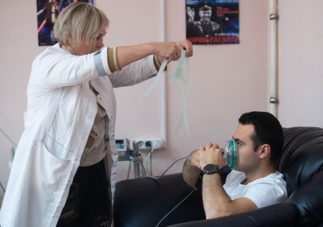Такие тренировки входят в программу медико-биологической подготовки космонавтов к полётам и происходят раз в году, в цикле не менее 10 сеансов. Во время процедуры, которая продолжается полтора часа, испытуемый сидит в кресле со специальной маской на лице и дышит «горным воздухом». А медицинские специалисты в это время записывают электрокардиограмму, измеряют артериальное давление и уровень сатурации крови.