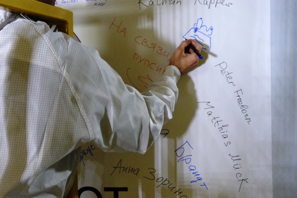 Yesterday the encapsulation of the fairing was finalized and the fairing mission logos glued on the fairing. At the end of the evening everybody signed the fairing and wrote personal wishes on the sticker.