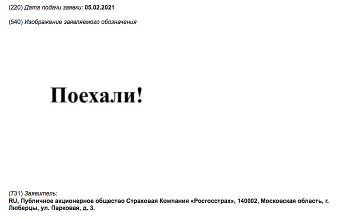 Страховая компания «Росгосстрах» (входит в группу банка «Открытие», которая сейчас находится под контролем Центробанка) подала заявку на регистрацию в качестве товарного знака фразы «Поехали!». Соответствующий документ «Открытые медиа» обнаружили в материалах Федерального института промышленной собственности (ФИПС). Заявка была подана компанией в ведомство 5 февраля, следует из документации Роспатента.