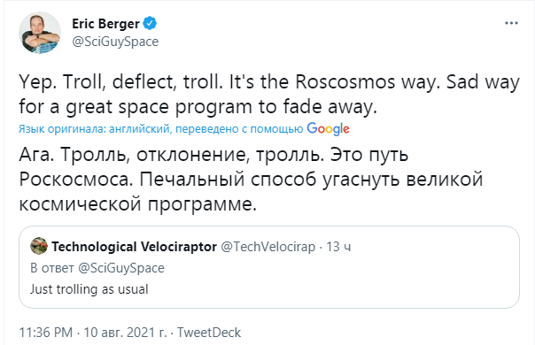 Русофоб Эрик Бергер продолжает глумиться https://twitter.com/SciGuySpace/status/1425194341006458880