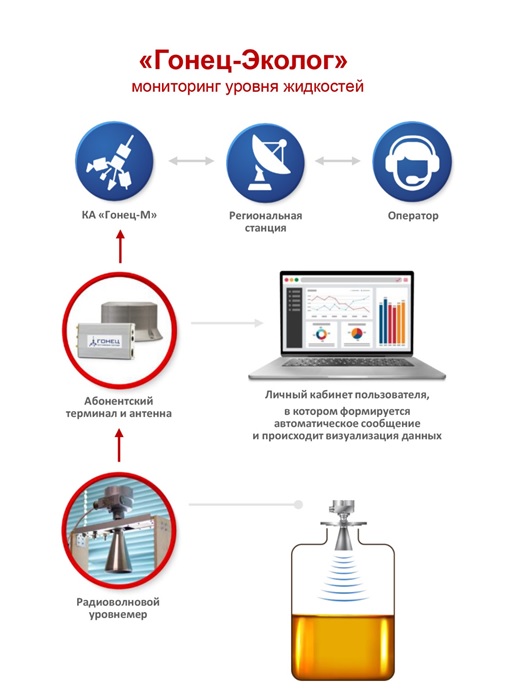 АО «Спутниковая система «Гонец» (входит в Госкорпорацию «Роскосмос») совместно с АО «НПП «Каскад» разработало уникальное решение для спутникового мониторинга резервуаров «Гонец-Эколог». С его помощью возможно в режиме близком к реальному времени измерять уровни жидкостей в открытых и закрытых резервуарах.