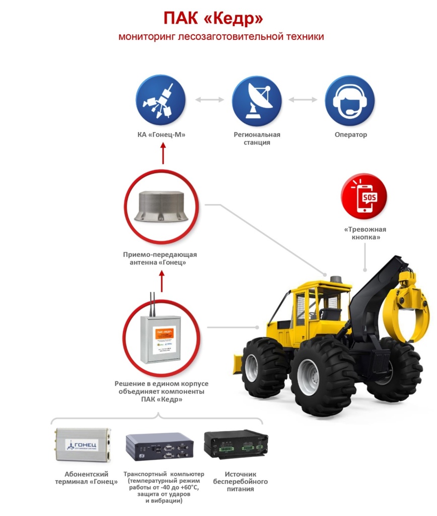 В качестве внедренного отраслевого решения спутниковый оператор предлагает программно-аппаратный комплекс «Кедр». В его состав входят спутниковый терминал «Гонец», транспортный компьютер, осуществляющий сбор и обработку данных на подвижном объекте, и источник бесперебойного питания. Решение выполняет удаленный мониторинг лесозаготовительной техники, обеспечивая ее эффективную и безопасную работу, а также предупреждает противоправные действия.