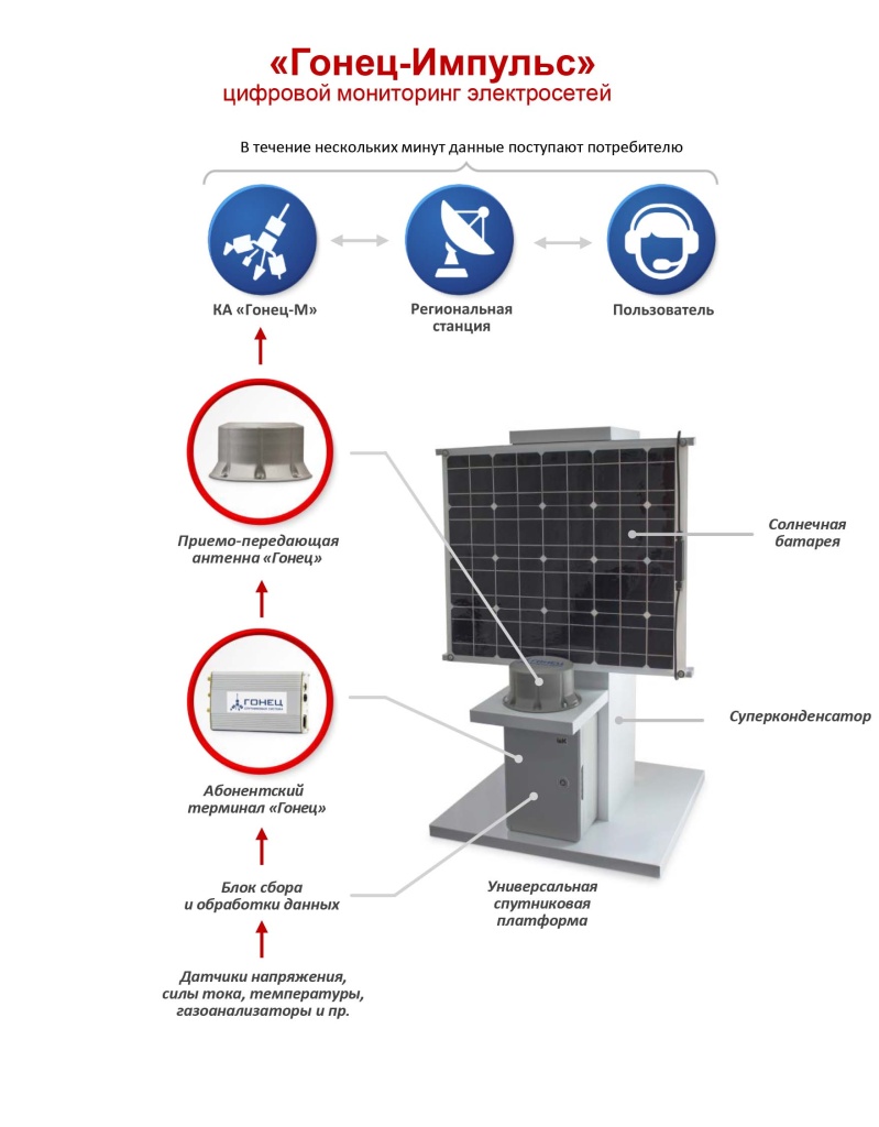 Производитель электрозащитного и электронного оборудования ООО «Импульс» совместно с АО «Спутниковая система «Гонец» (входит в Госкорпорацию «Роскосмос») завершает разработку и проводит испытания опытного образца универсальной спутниковой платформы, предназначенной для оперативного сбора и передачи данных о состоянии электросетей и трубопроводов с различных датчиков, измерителей напряжения, силы тока, температуры, газоанализаторов и другого оборудования.