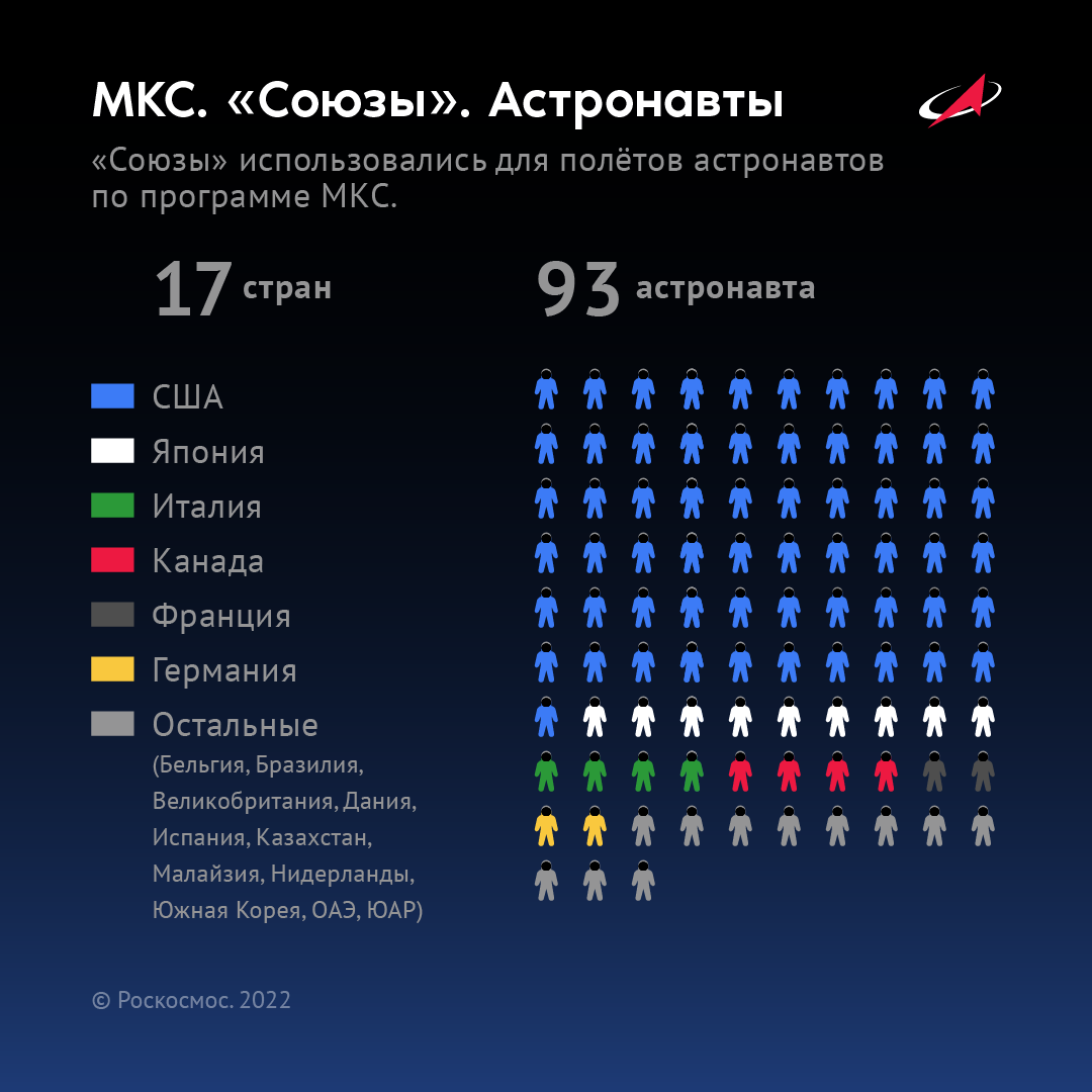 Пресс-служба Роскосмоса посчитала количество зарубежных космонавтов, которые летали на кораблях «Союз» за всё время реализации программы МКС, учитывая запуски, перестыковки и посадки. Всего «Союзы» использовались для полёта 93 зарубежных космонавтов из 17 стран: