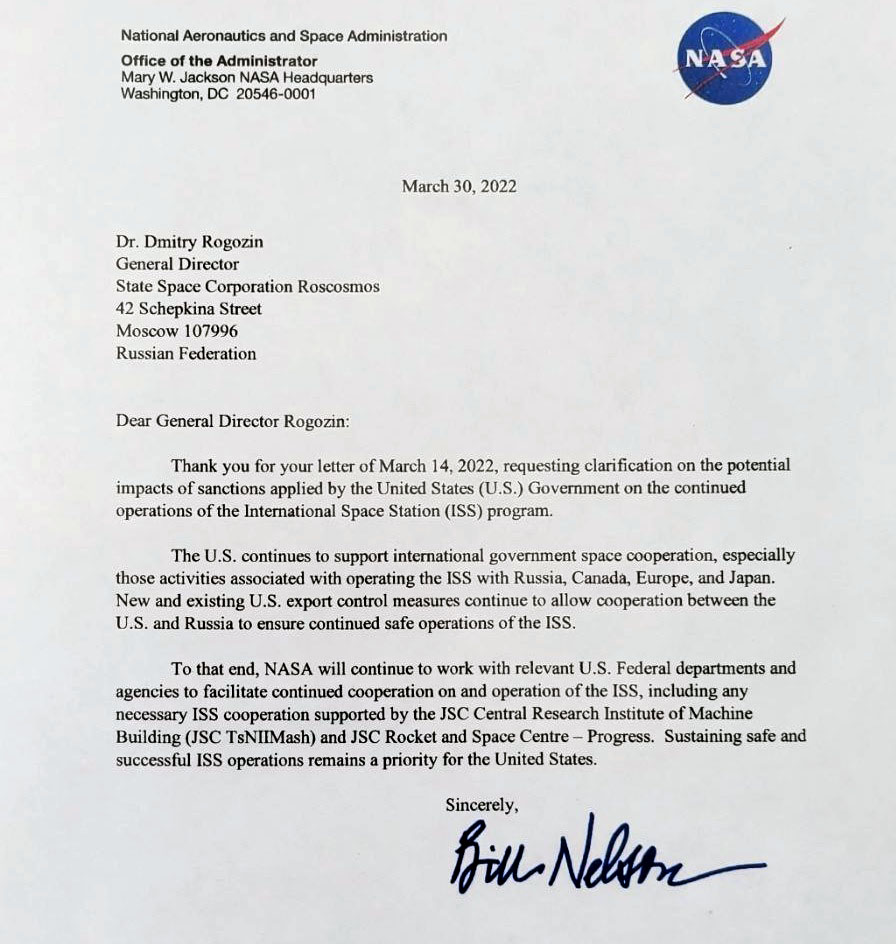 В частности, в письме Билла Нельсона говорится, что «NASA продолжит взаимодействовать с соответствующими федеральными ведомствами и агентствами США в целях содействия дальнейшему сотрудничеству в рамках МКС и ее эксплуатации, включая любое необходимое сотрудничество по программе МКС при поддержке АО ,,Центральный научно-исследовательский институт машиностроения" (АО ,,ЦНИИмаш") и АО ,,РКЦ ,,Прогресс"". Поддержание безопасных и успешных операций МКС остается приоритетом для Соединенных Штатов».