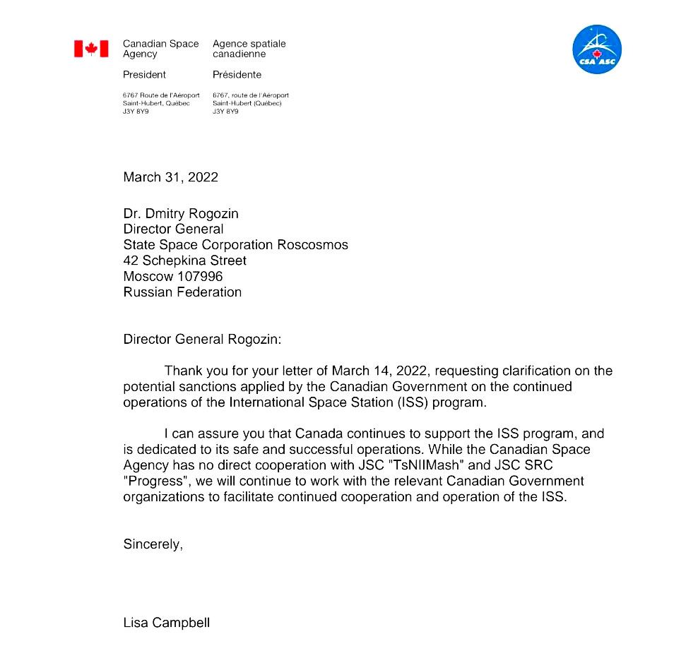 Я могу заверить Вас, что Канада продолжает поддерживать программу МКС и привержена её безопасной и успешной эксплуатации. Хотя Канадское космическое агентство не имеет прямого сотрудничества с АО «ЦНИИмаш» и АО «РКЦ ,,Прогресс"», мы продолжим работать с соответствующими правительственными организациями Канады, чтобы способствовать дальнейшему сотрудничеству и эксплуатации МКС.