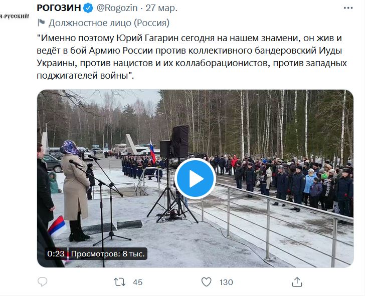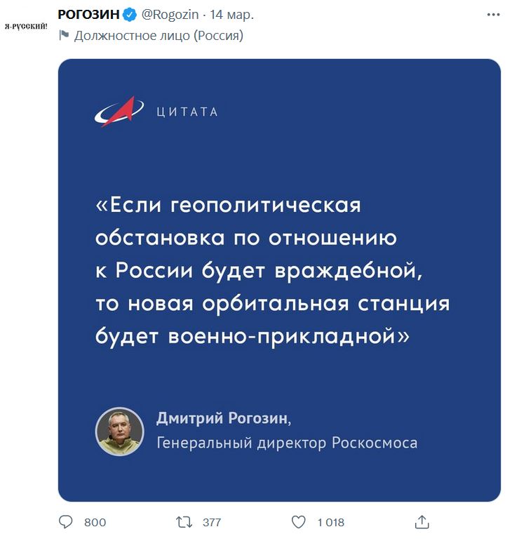 Дмитрий Рогозин в сегодняшнем интервью RT: «Я уверен, что освоение космоса требует серьёзных совместных усилий многих стран, поэтому подмешивание сюда политики только вредит делу». Тем временем Дмитрий Рогозин: