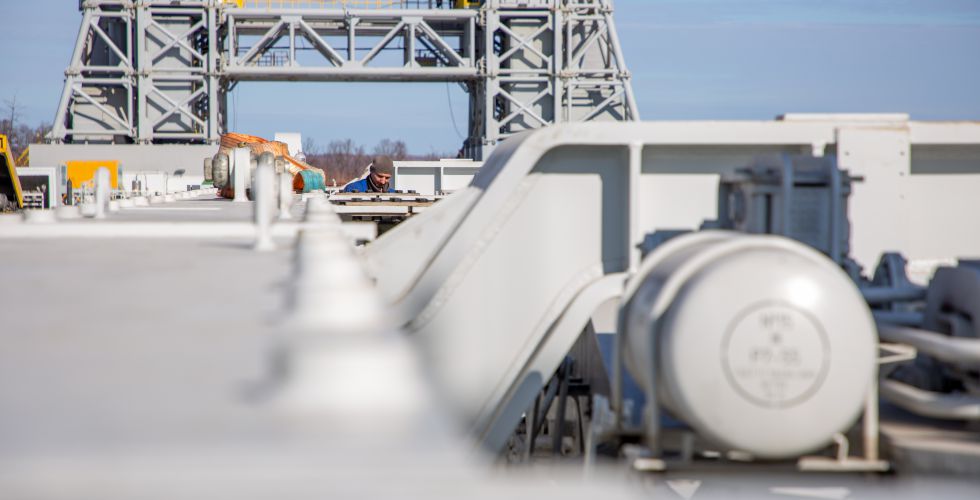 Специалисты готовятся к очередному этапу: перекладке «пакета» на рабочее место и стыковке третьей ступени.