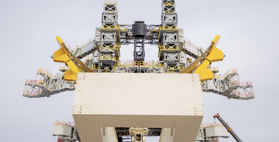 Грузомакет, имитирующий ракету-носитель «Ангара», с помощью транспортно-установочного агрегата перевели в вертикальное положение, после чего установили в стартовое сооружение.