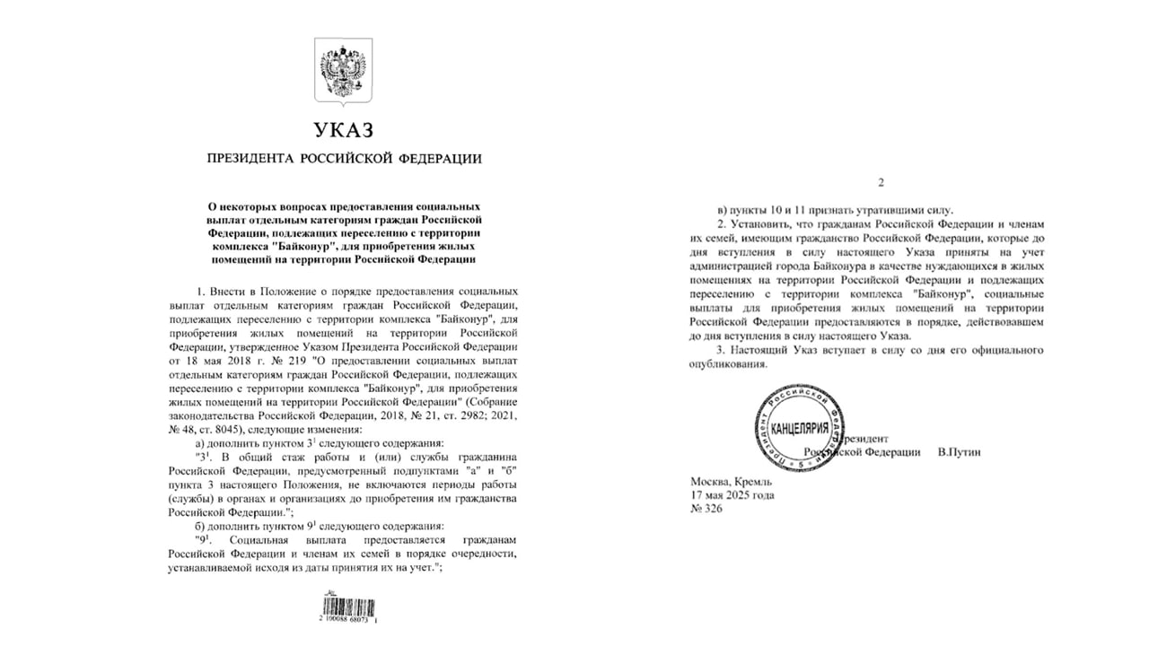 Президент России Владимир Путин подписал Указ о внесении изменений в Положение о порядке предоставления социальных выплат для приобретения жилья российским гражданам при переселении с Байконура в Россию.