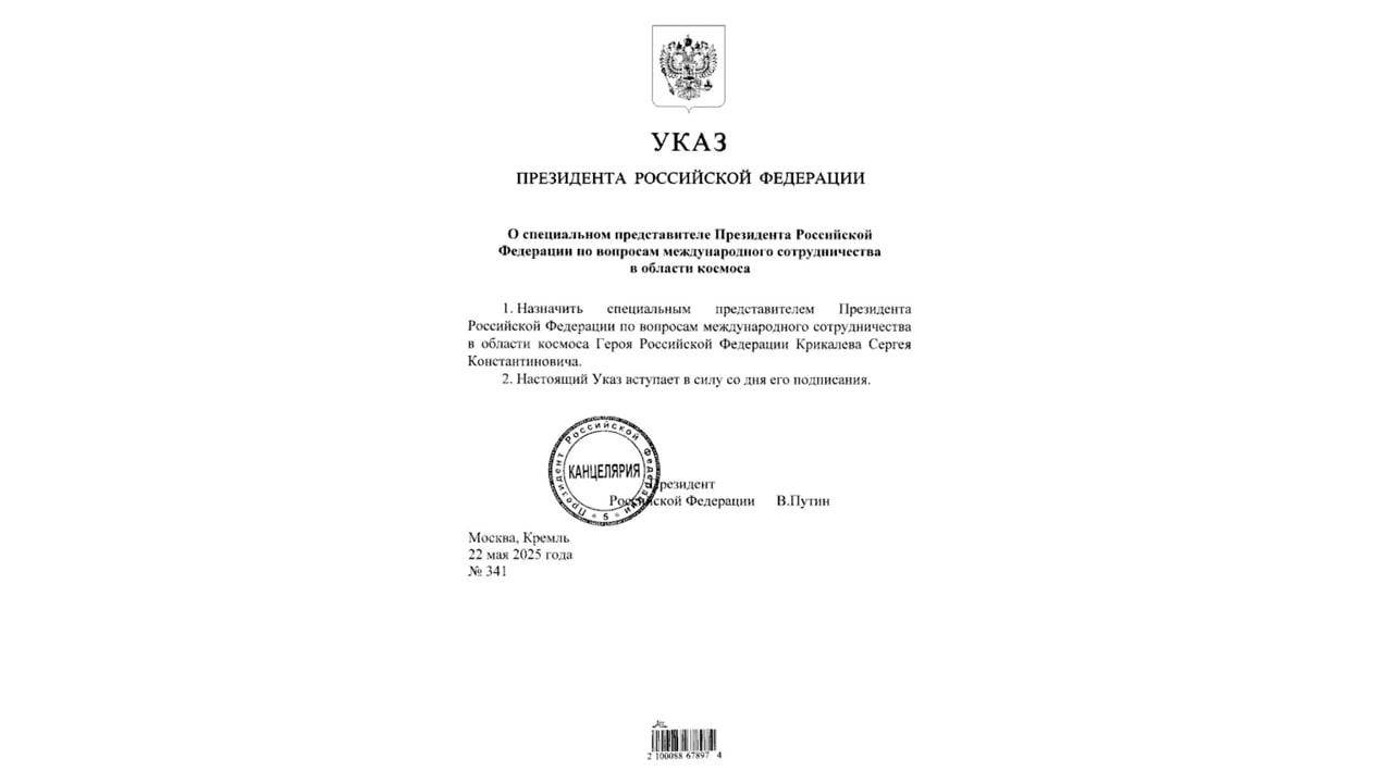 Соответствующий Указ Президента Российской Федерации от 22.05.2025 № 341 «О специальном представителе Президента Российской Федерации по вопросам международного сотрудничества в области космоса» опубликован на официальном интернет-портале правовой информации.
