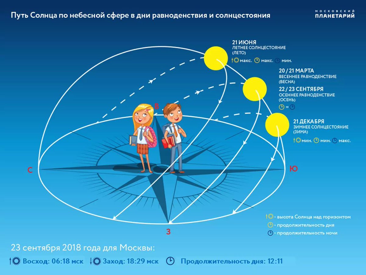 Сегодня в 04:55 мск в северном полушарии Земли наступила астрономическая осень. Этот день называют днем осеннего равноденствия. Солнце восходит точно на востоке и заходит точно на западе, находясь ровно 12 часов над горизонтом и 12 часов под горизонтом, то есть день равен ночи.