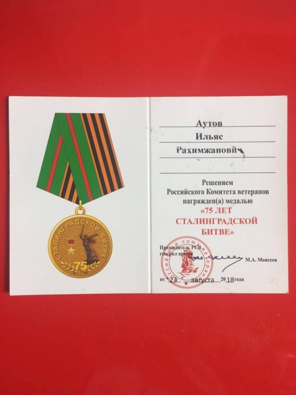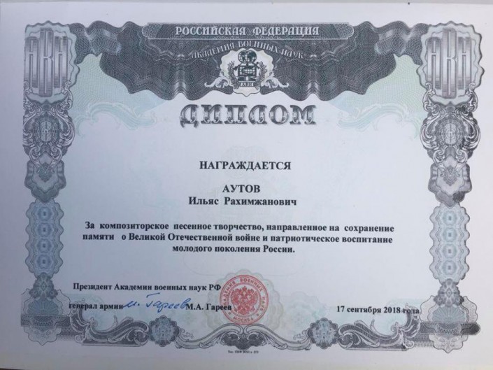 Лидер известной казахстанской группы Motor-Roller Ильяс Аутов был награжден медалью Российского комитета ветеранов и дипломом Академии военных наук РФ за вклад в сохранение памяти о Великой Отечественной войне. Об этом музыкант сообщил на своей странице Facebook.
