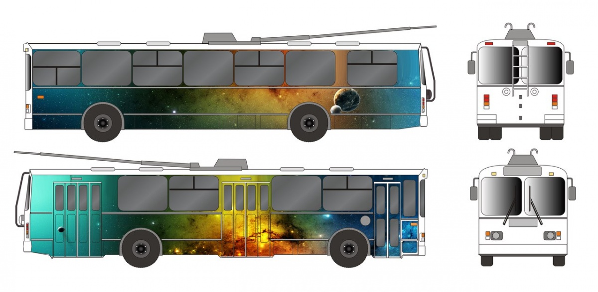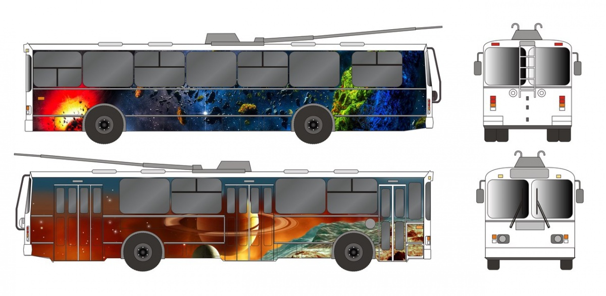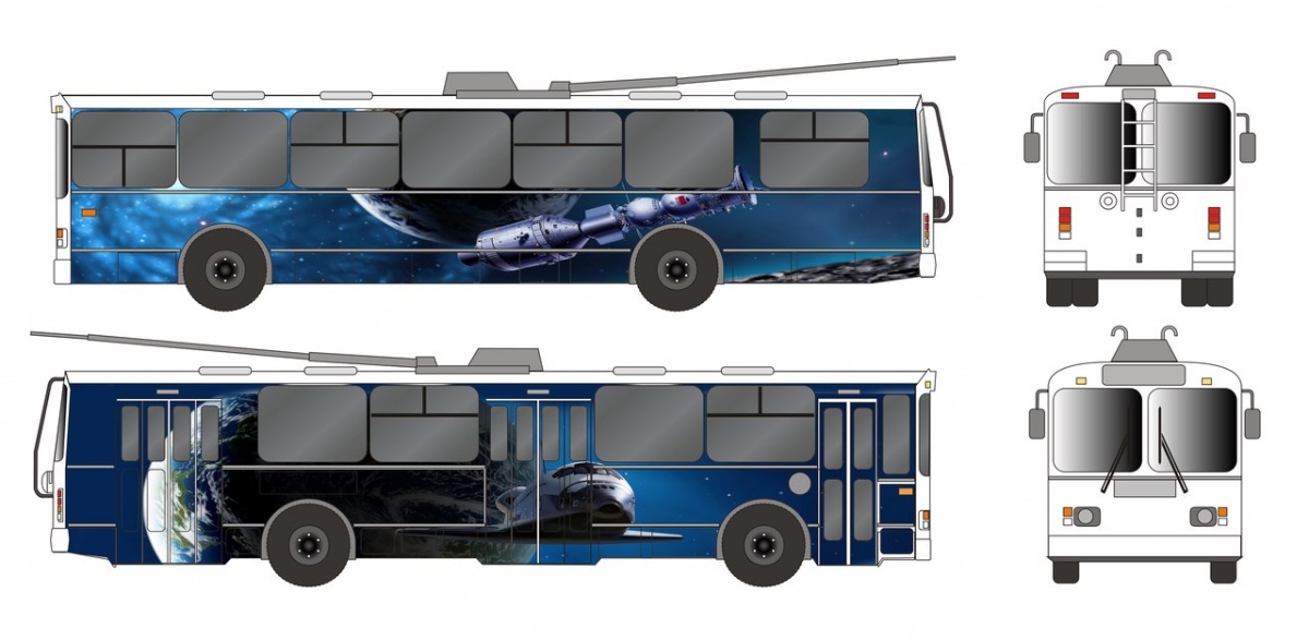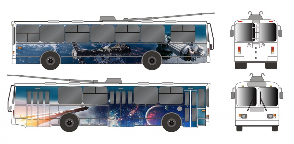 На одной из сторон троллейбуса видна ракета, летящая в космосе