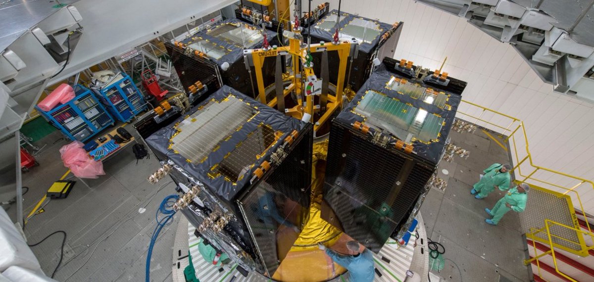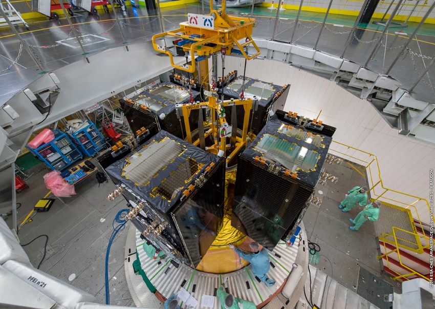 The next four satellites to join Europe's Galileo navigation system are ready for launch on a single Ariane 5 rocket. Credit: ESA/CNES/Arianespace – Photo Optique Video du CSG – P. Baudon
