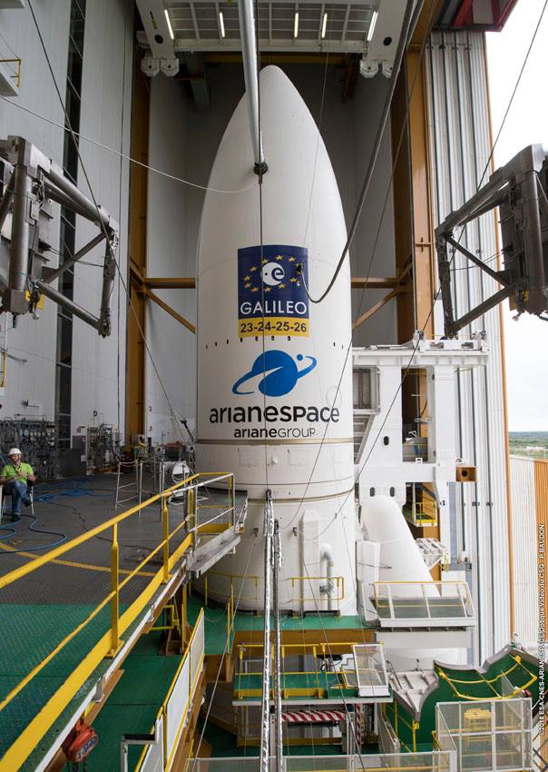 A quartet of Galileo satellites is mounted atop the Ariane 5 launcher, ready to advance the deployment of Europe's home-grown navigation network.