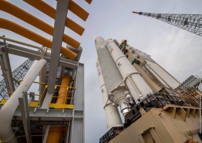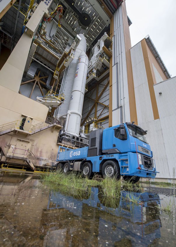 An Ariane 5 rocket nears its launch pad Monday in French Guiana. Credit: ESA/CNES/Arianespace – Photo Optique Video du CSG – P. Baudon