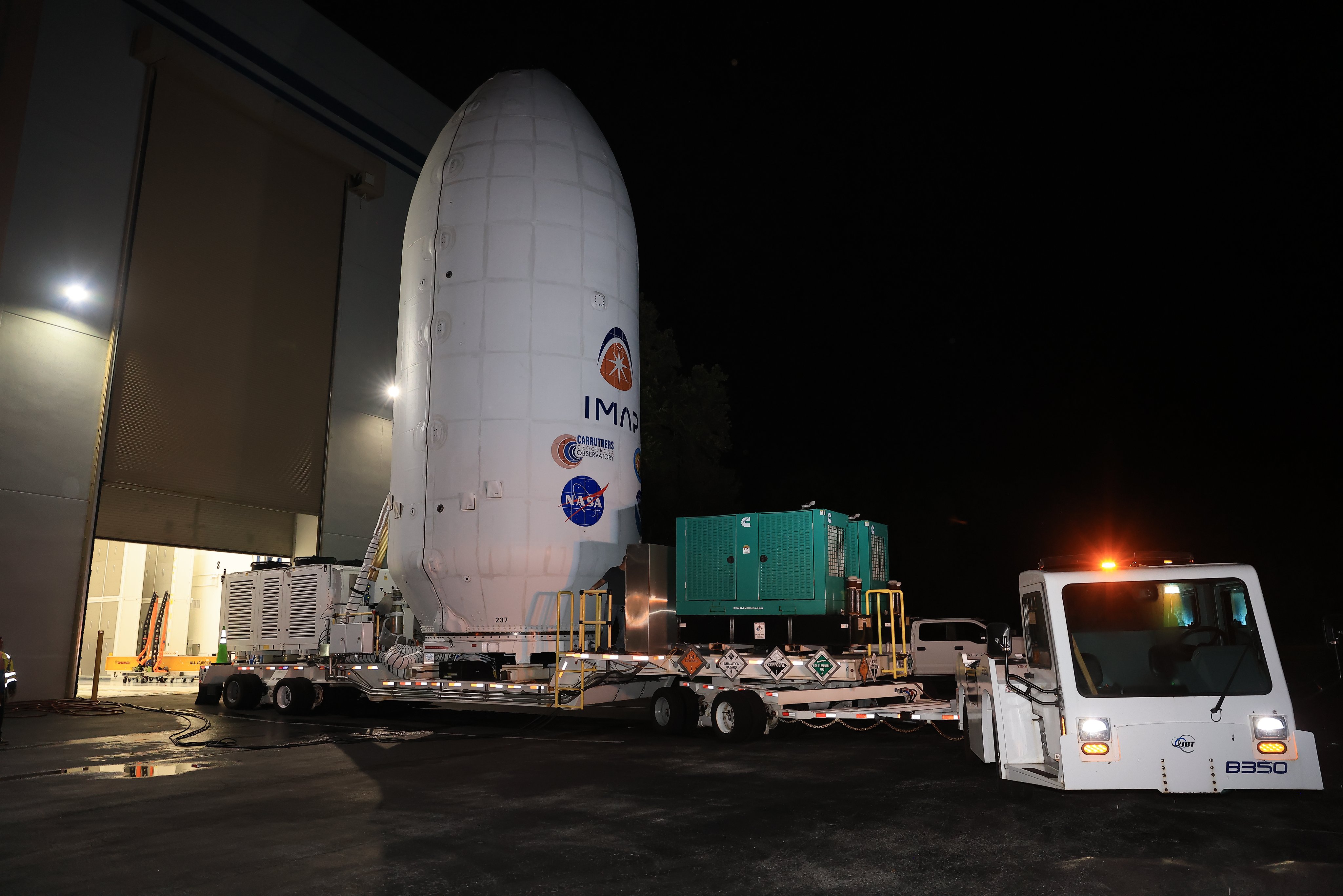 NASA's IMAP (Interstellar Mapping and Acceleration Probe) completed another step in a journey that will eventually take it about a million miles from Earth. Crews transported NASA's newest space weather observatory and two rideshares from the Astrotech Space Operations payload processing facility in Titusville to a SpaceX hangar at nearby Launch Complex 39A at NASA's Kennedy Space Center in Florida on Sept. 18. A SpaceX Falcon 9 rocket will launch the missions no earlier than 7:32 a.m. EDT Tuesday, Sept. 23, from Launch Complex 39A from NASA Kennedy.