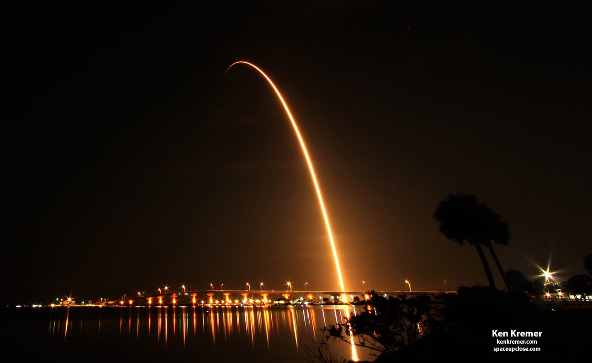 Streak Shot! Beefed Up #Falcon9 Blazes Trail to Orbit with 7.8 Ton #Telstar19 over M. Brewer Bridge - Thx to @SpaceX ! At 150 AM July 22. Credit: @ken_kremer http://spaceupclose.com