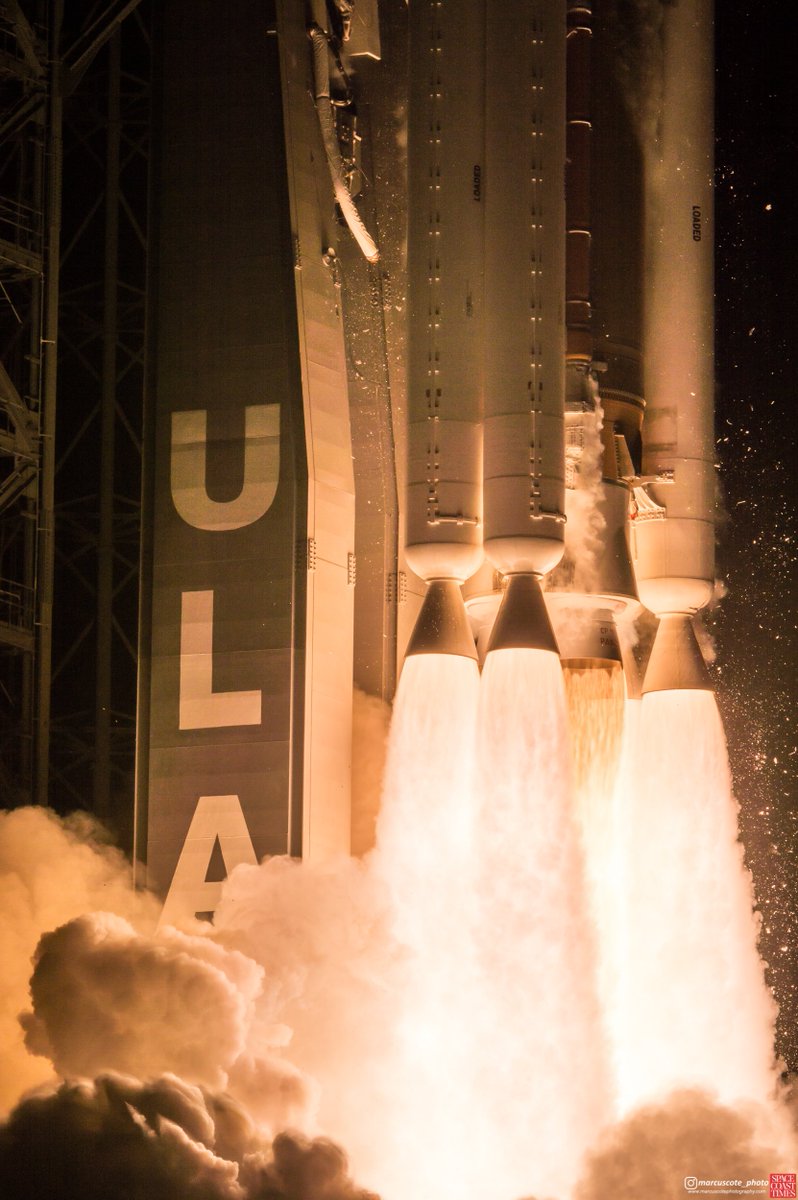 #AtlasV and #AEHF4 lift above the fiery rage created by five Aerojet Rocketdyne SRBs and one RD-180 liquid-fuel engine. Image was taken using a telephoto lens and sound-triggered camera placed just several hundred feet from the rocket (Photo: @marcuscote_photo/ @spacecoasttimes)