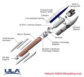 Did you know? The #AtlasV 551 with #AEHF4Road2Launch has a 5-m fairing, 1 RD-180 main engine, 5 solid rocket boosters and 1 RL10A Centaur upper stage engine