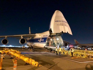 The Russian built Antonov is one of the only airplanes in the world large enough to haul our satellites. Our Antonov arrived at 8 am sharp, not long after a sudden rain storm blew through that left us with a beautiful double rainbow.