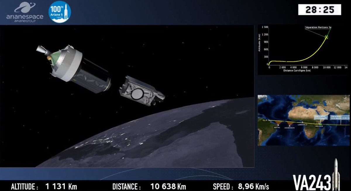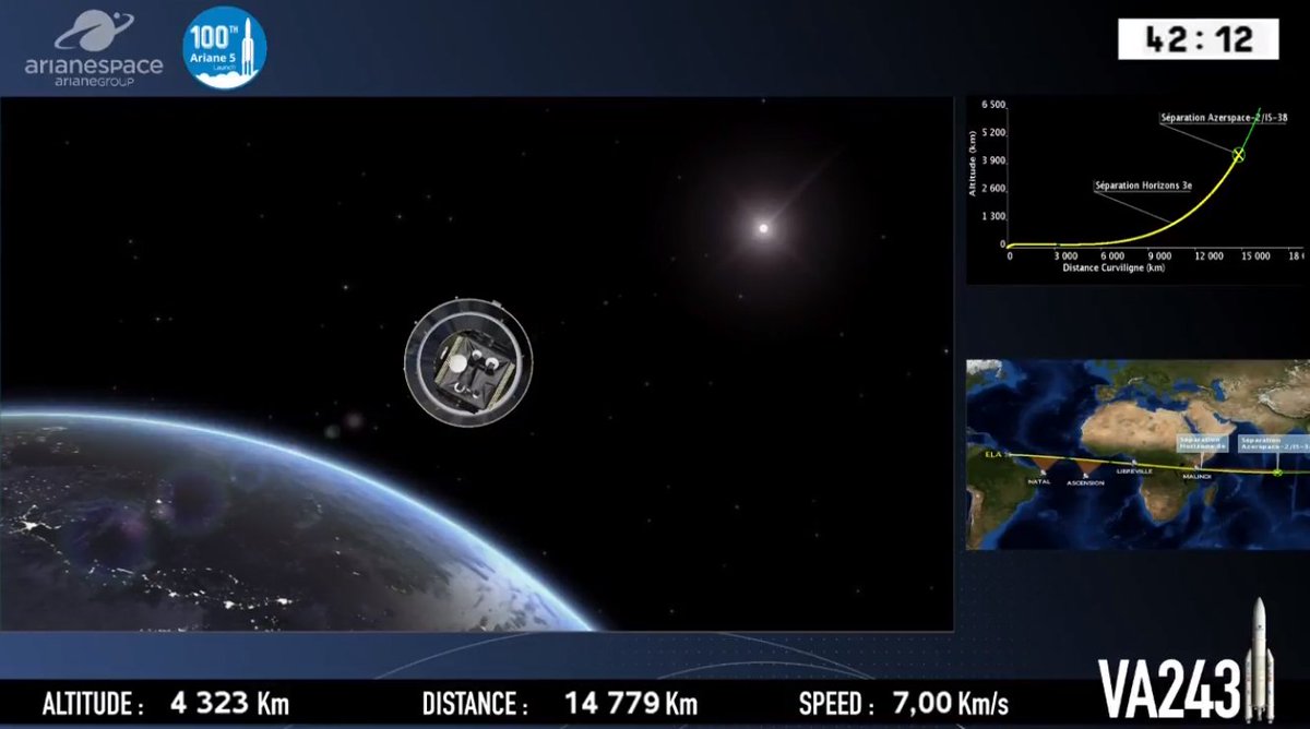 "Arianespace is delighted to announce that Horizons 3e and Azerspace 2/Intelsat 38 have been separated as planned in their targeted geostationary transfer orbit. For Ariane 5 mission No. 100, our heavyweight launcher has once more performed flawlessly. Congratulations to all," said Stephane Israel, CEO of Arianespace.