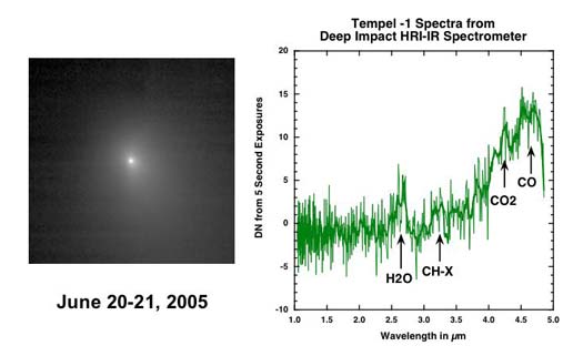 These data were acquired from June 20 to 21, 2005. The picture of Tempel 1 was taken by the flyby spacecraft's medium-resolution instrument camera. The infrared spectrometer uses the same telescope as the high-resolution instrument camera.