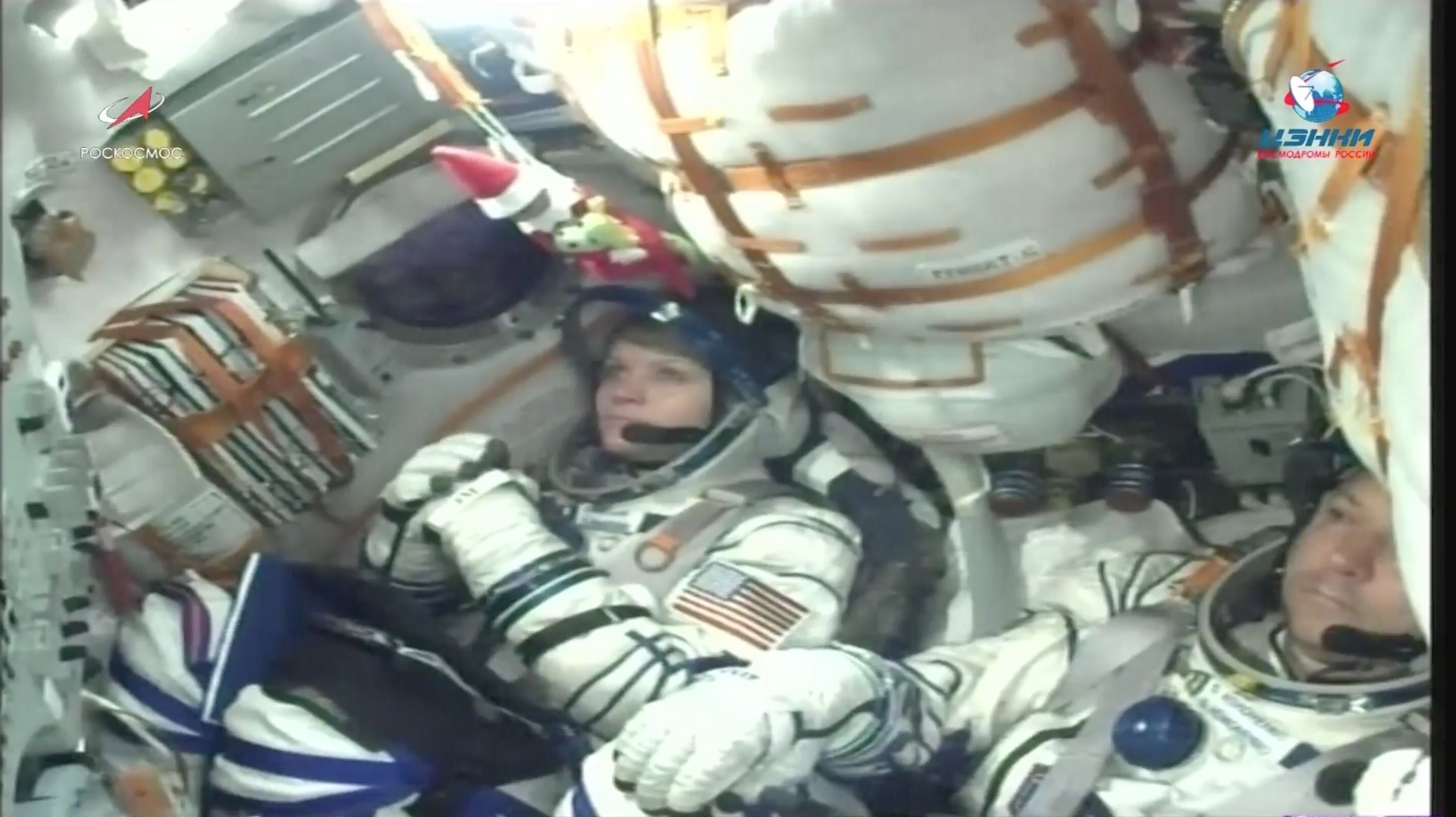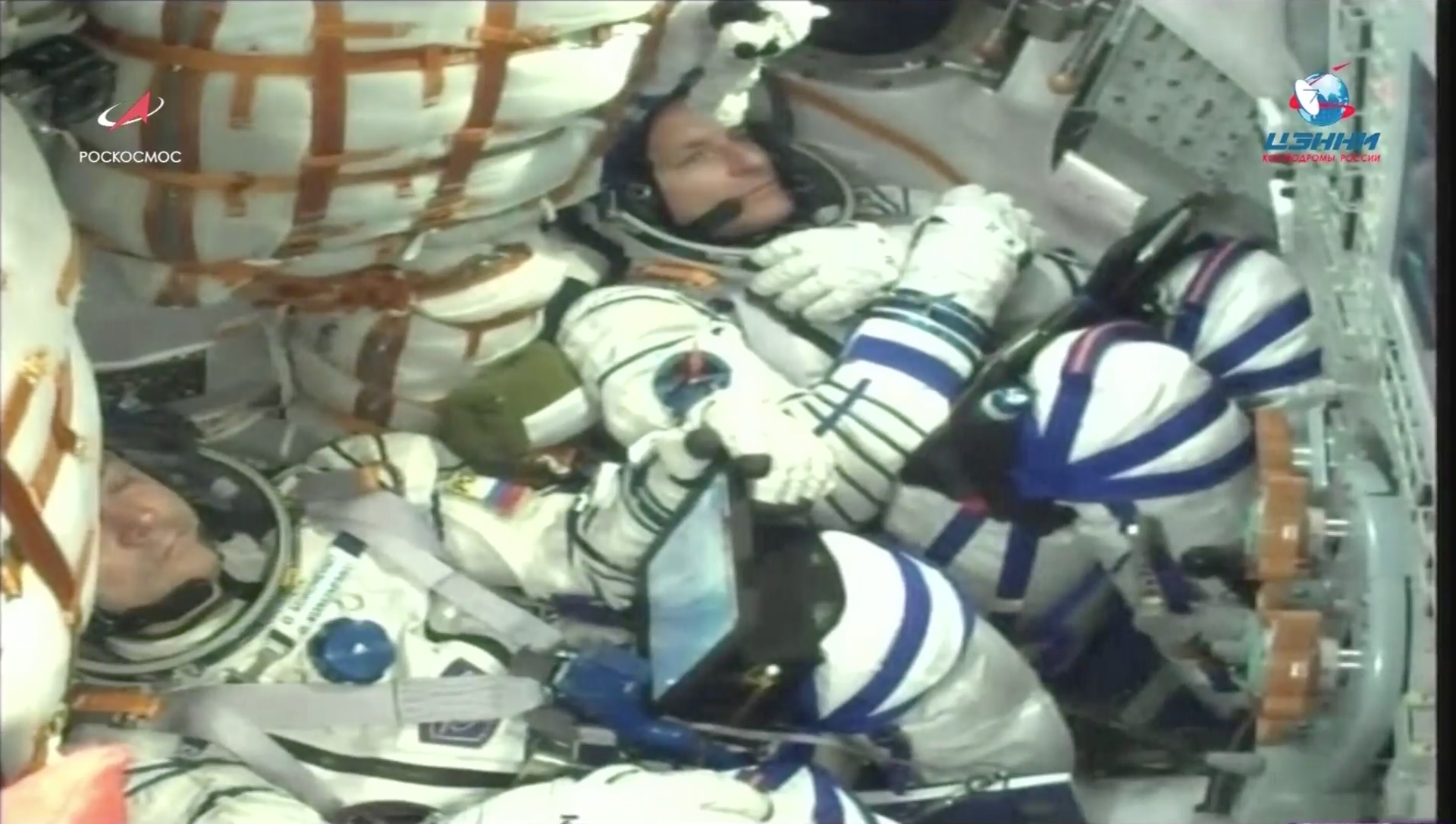 Here's a view of Oleg Kononenko and David Saint-Jacques in their seats inside the Soyuz MS-11 spacecraft. The hatch to the capsule are now closed.