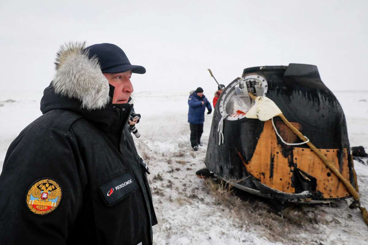 Dmitry Rogozin, head of the Russian space agency Roscosmos, presents flowers to NASA'ss Serena Aunon-Chancellor after landing in a remote area outside the town of Zhezkazgan, formerly known as Dzhezkazgan, Kazakhstan, on Thursday, Dec. 20, 2018. Three astronauts have returned to Earth after more than six months aboard the International Space  ...