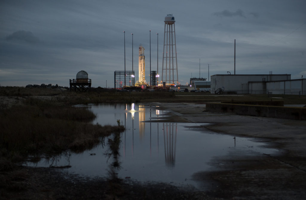 The Northrop Grumman Antares rocket, with Cygnus spacecraft aboard, is seen on Pad-0A, Tuesday, Nov. 13, 2018, at NASA's Wallops Flight Facility in Virginia. Credit: NASA/Joel Kowsky