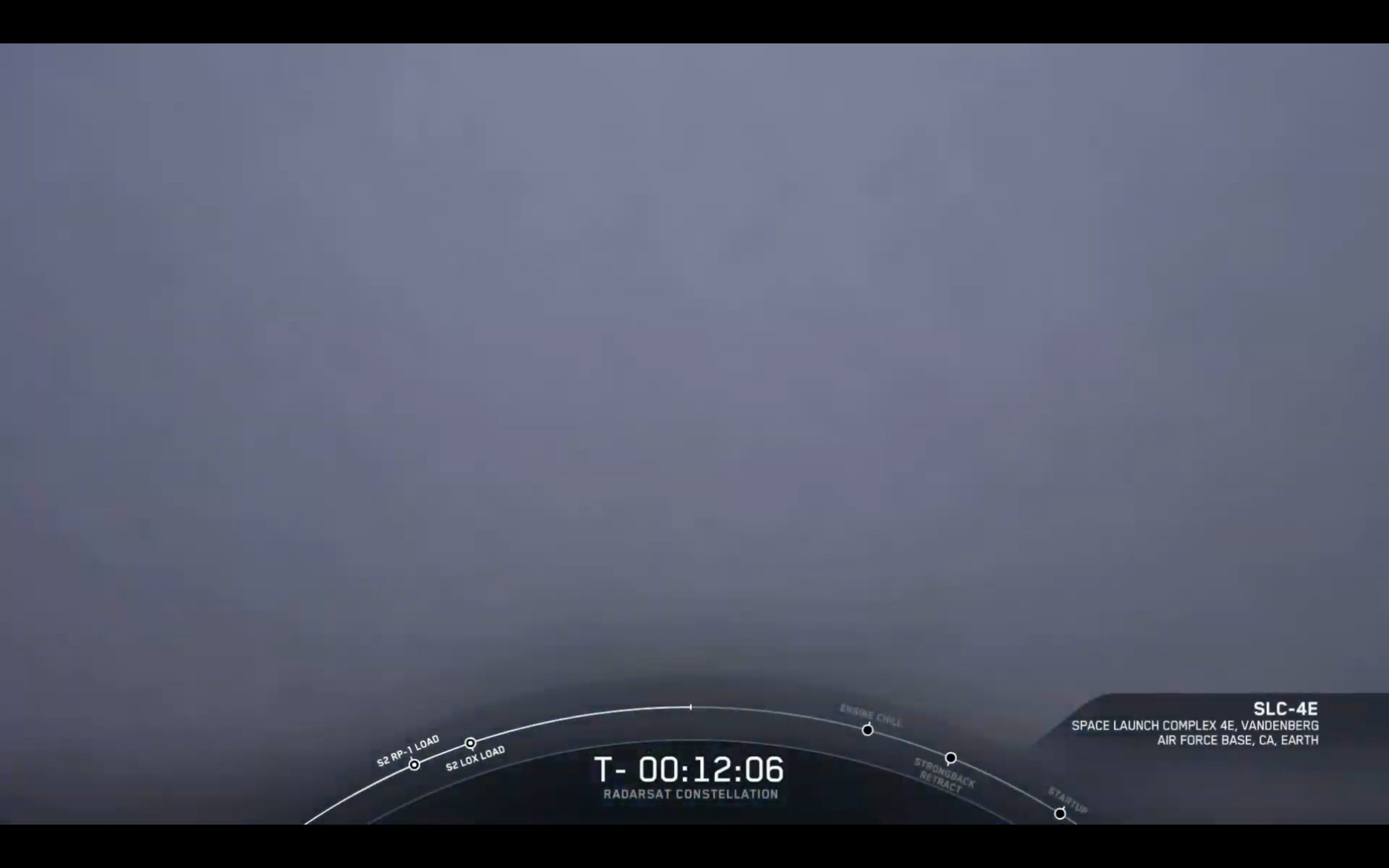 SpaceX's live webcast of today's launch is underway. It's a foggy morning at Vandenberg Air Force Base with all camera views of the Falcon 9 rocket currently obstructed by low visiblity. But weather conditions are "go" for liftoff with the Radarsat Constellation Mission at 7:17 a.m. PDT (10:17 a.m. EDT; 1417 GMT).