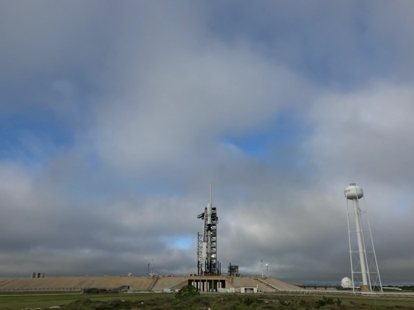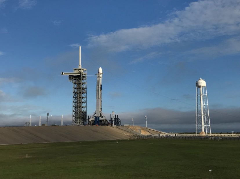 Good morning fr om launch pad 39A, wh ere a SpaceX Falcon 9 rocket — sporting the marks of a past mission into space — is standing vertical in preparation for liftoff at 3:46 p.m. EST (2046 GMT).