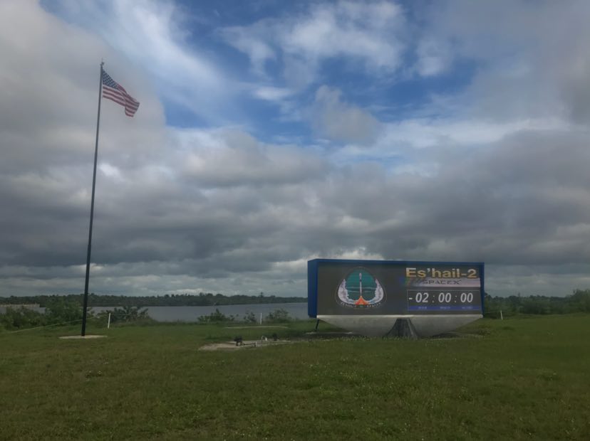 T-minus 2 hours. It's a mostly cloudy afternoon here at NASA's Kennedy Space Center in Florida, where a Falcon 9 rocket is standing at pad 39A for liftoff with the commercial Es'hail 2 communications satellite.